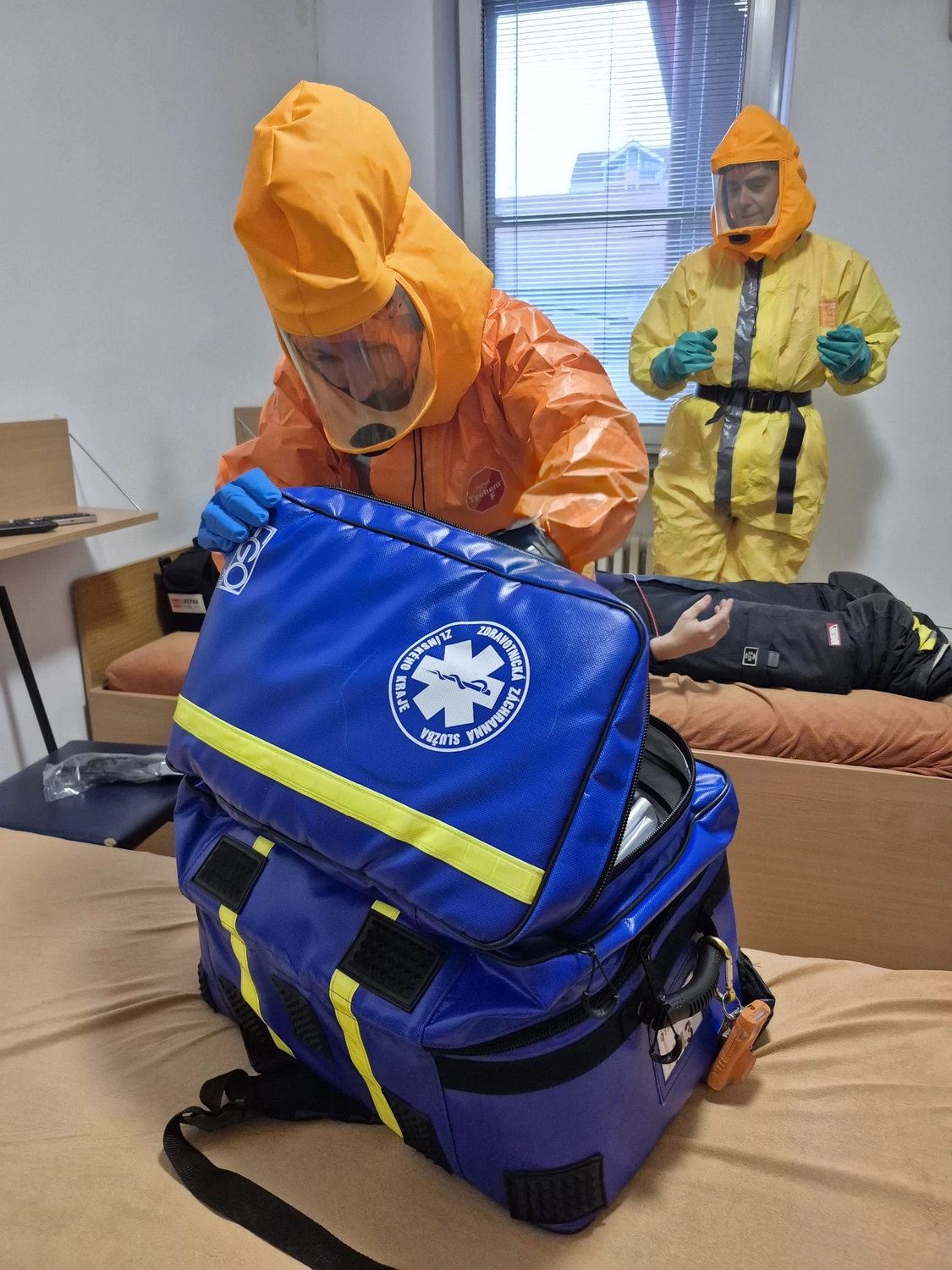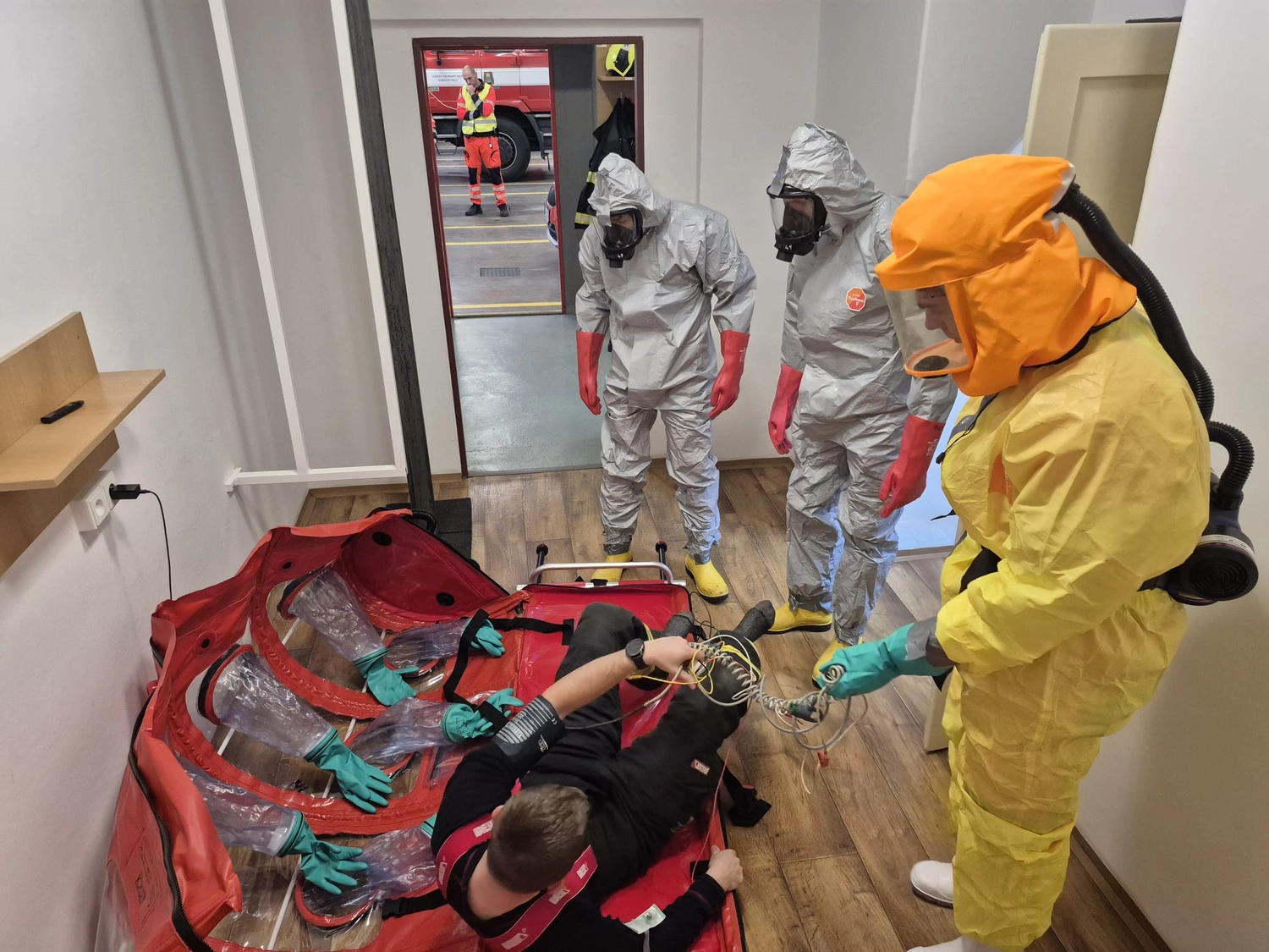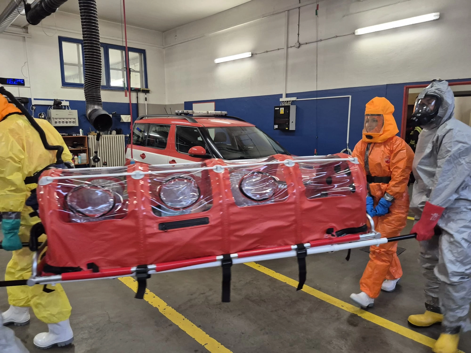 Jeden den, dva výcviky, dvě naprosto odlišné situace a místa zásahu vzdálená od sebe zhruba 35 kilometrů. Před pár dny se část z našich záchranářů se specializovanou způsobilostí podrobila náročnému výcviku. Dopoledne je v areálu hasičské stanice v Uherském Brodě čekal zásah u muže, který se vrátil z Rwandy. Pacient měl vysokou horečku, objevil se u něj i průjem. To znamená: Výcvik v ochranných oblecích, zajištění pacienta v izolačním vaku, perfektní dekontaminace posádky, která s nakaženým přišla do styku. V druhé – odpolední fázi – vstoupil do budovy Státního okresního archivu Zlín – Klečůvka ozbrojený muž, který postupně poranil několik osob.